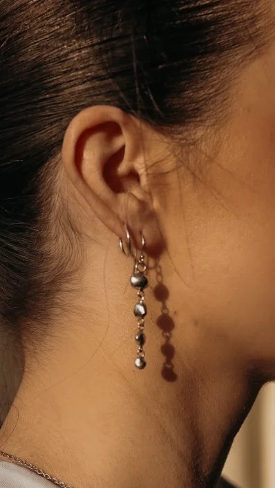 The Lumen Drop Earrings are crafted in solid sterling silver, featuring a series of softly sculpted forms suspended along a fine chain. Designed to catch the light from every angle, each element reflects a subtle, shifting glow as it moves.